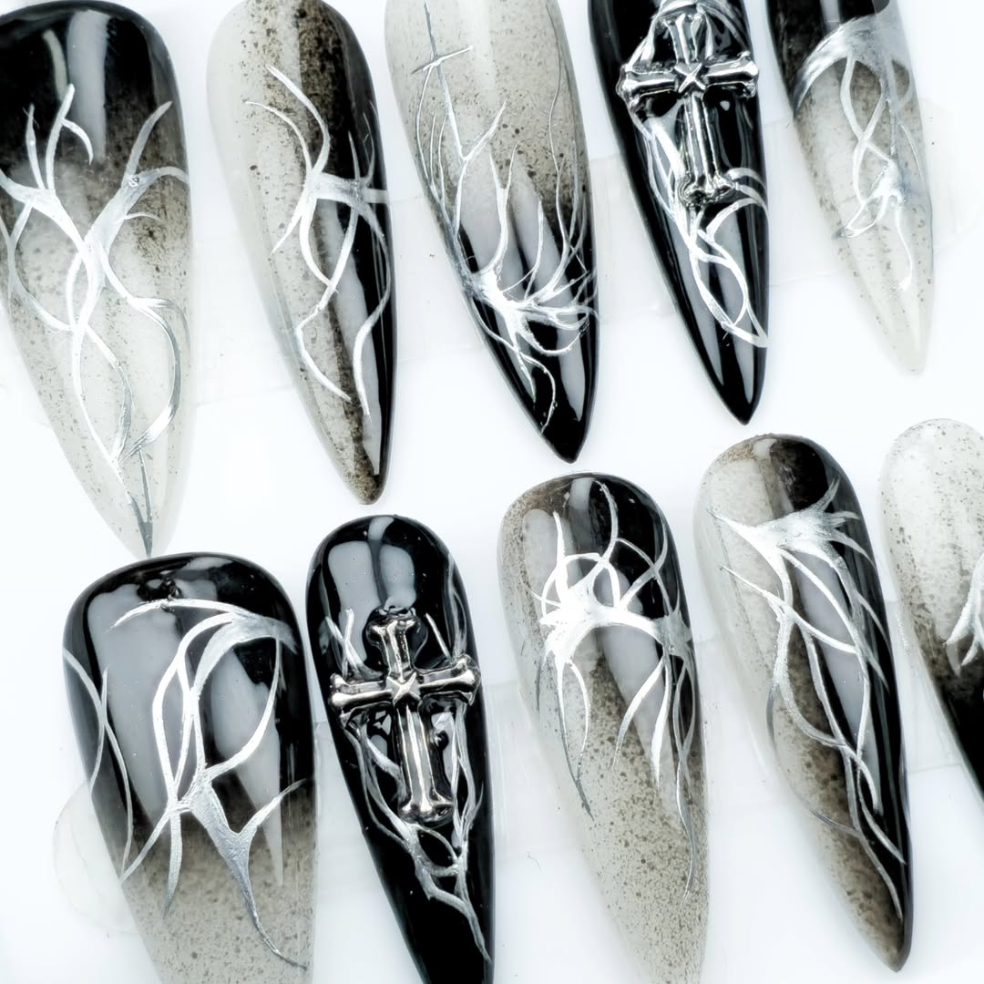 Unhas postiças de gel com design preto e prata, adornadas com cruzes e detalhes de ramos. Estilo moderno e sofisticado.