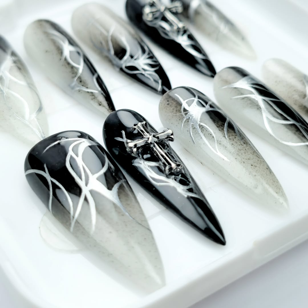 Transforme suas unhas com este design ousado e sofisticado de unhas postiças gel, inspirado em ramos e cruzes. Cada unha traz um fundo preto e cinza com detalhes artísticos em prata, criando um visual moderno e único. O destaque vai para a cruz metálica que adorna algumas das unhas, trazendo um toque de estilo e profundidade ao design. As linhas finas que representam os ramos adicionam uma sensação de elegância e mistério, perfeitas para quem procura um visual imponente e delicado ao mesmo tempo. Seja para um evento ou para o dia a dia, essas unhas trazem um estilo sofisticado e moderno que vai se destacar.
