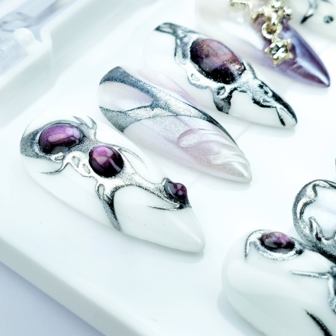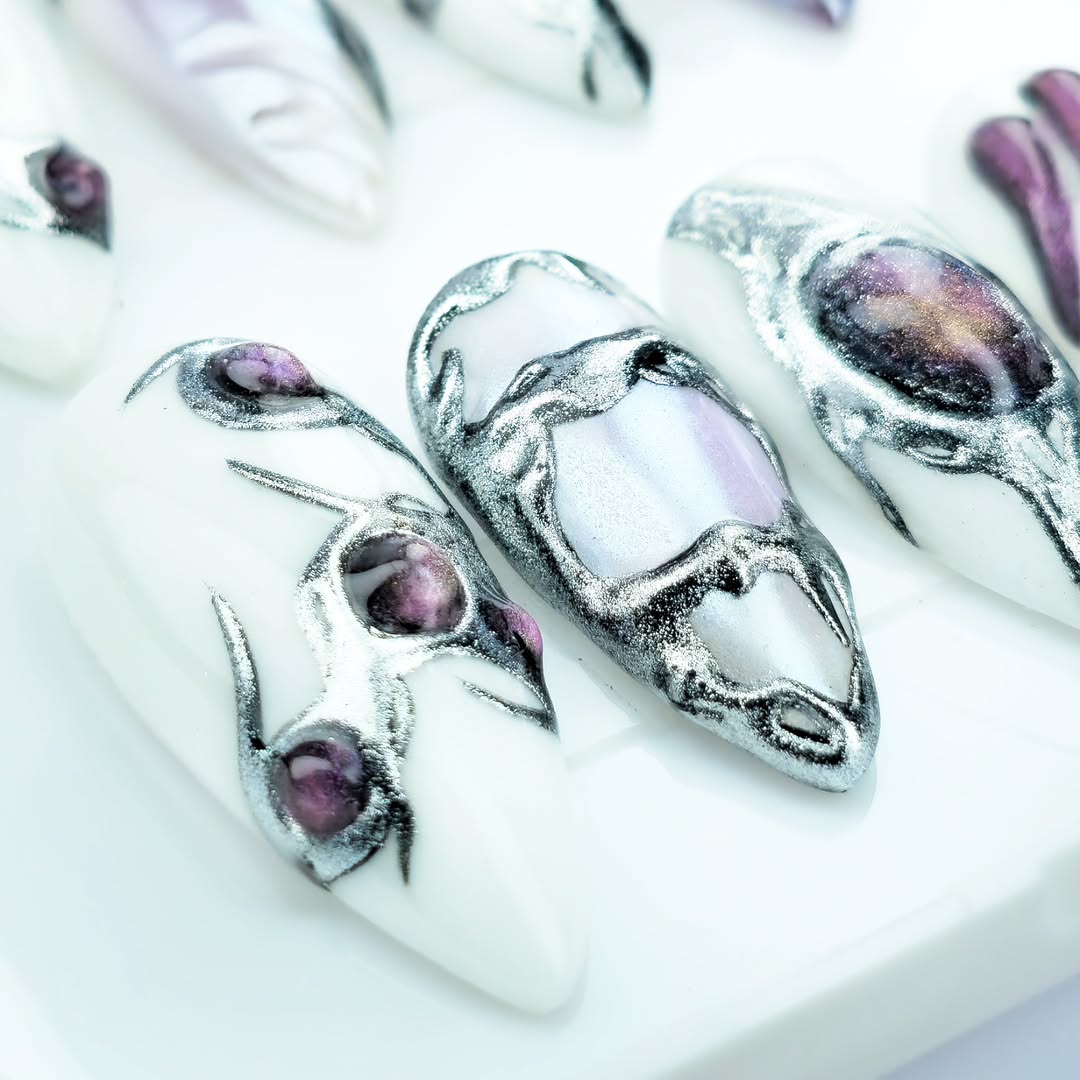 Unhas postiças com design futurista e elegante, combinando base branca com detalhes metálicos prateados e roxos. O acabamento cromado e os elementos em alto-relevo, como pedras e aplicações, conferem um visual sofisticado e moderno, com uma estética refinada e futurista.