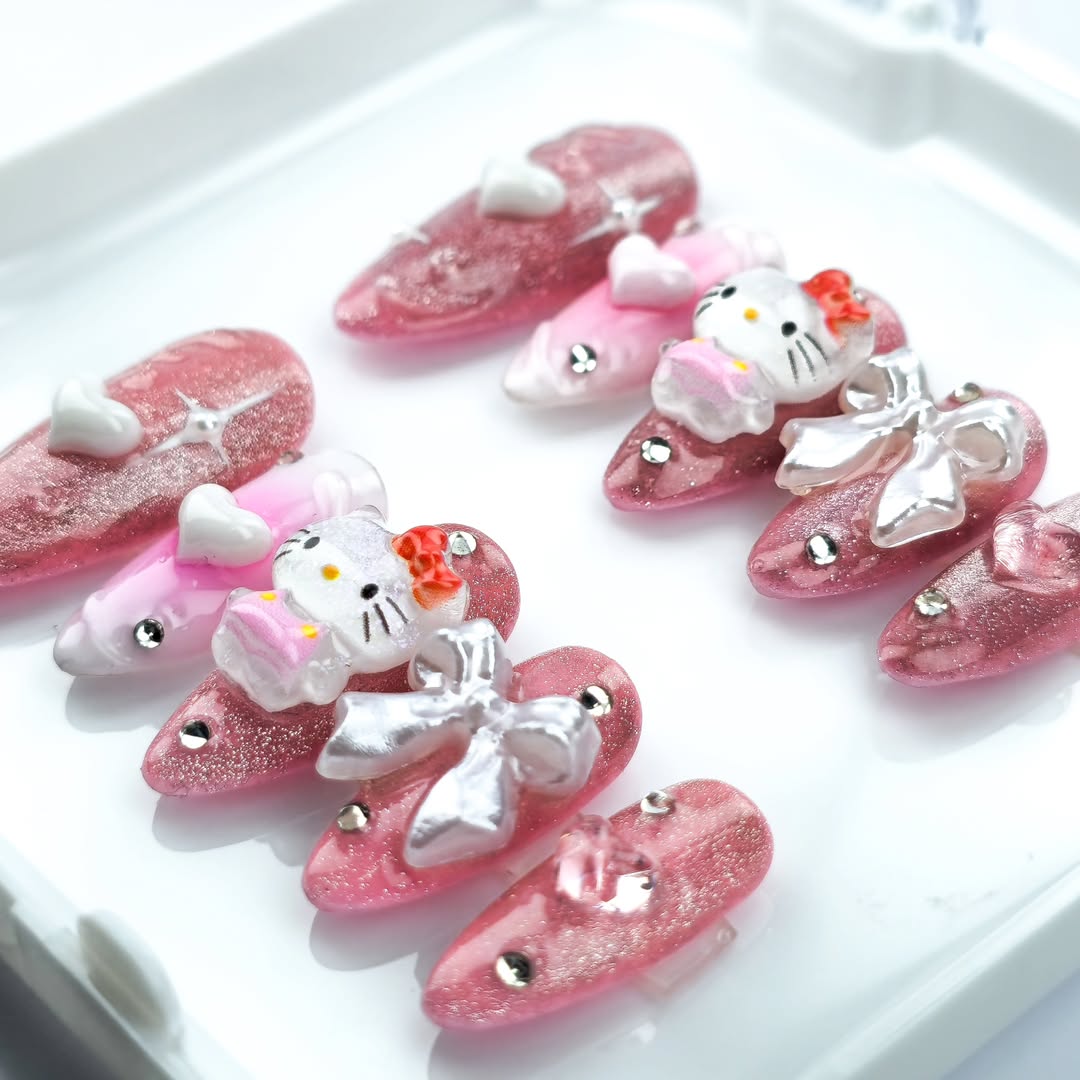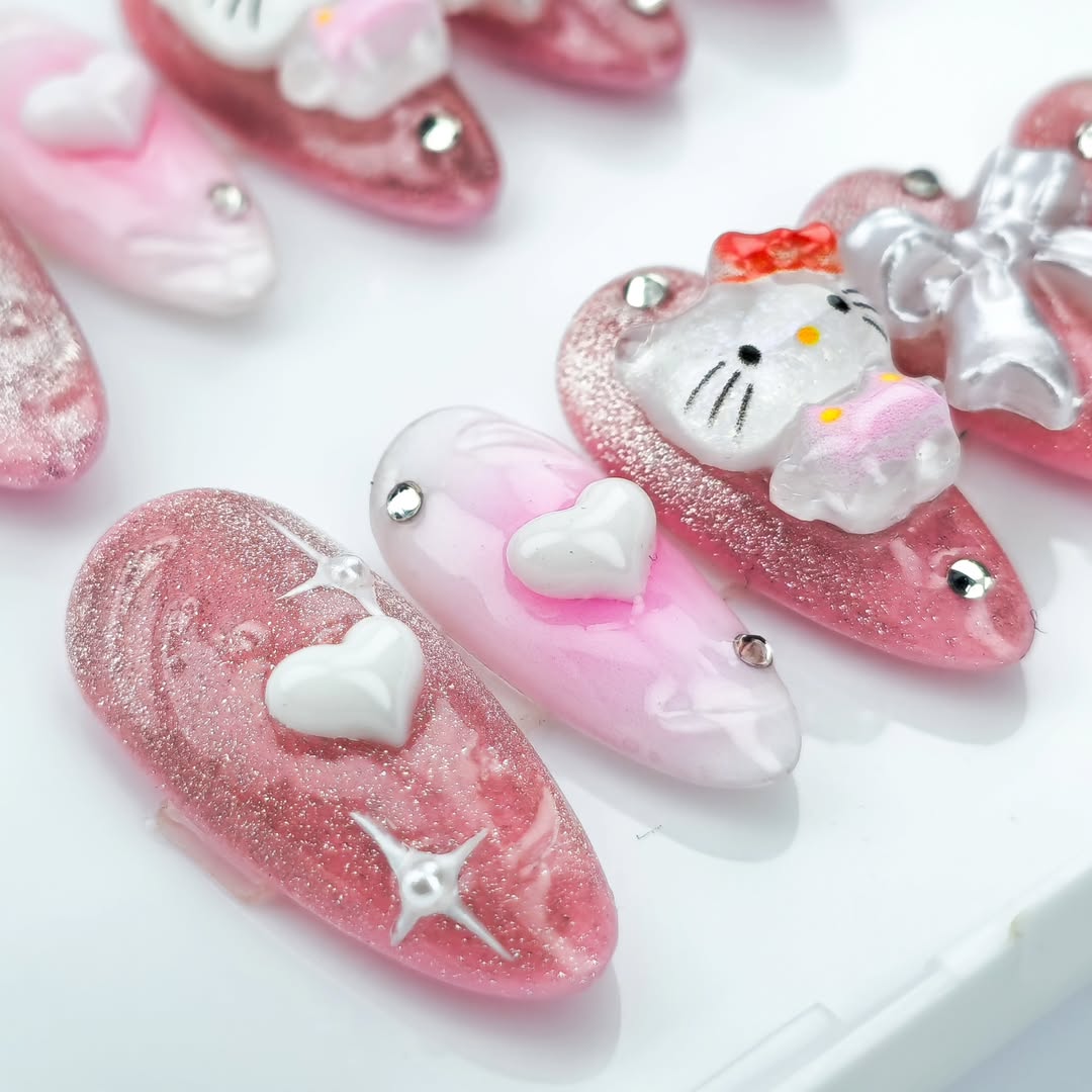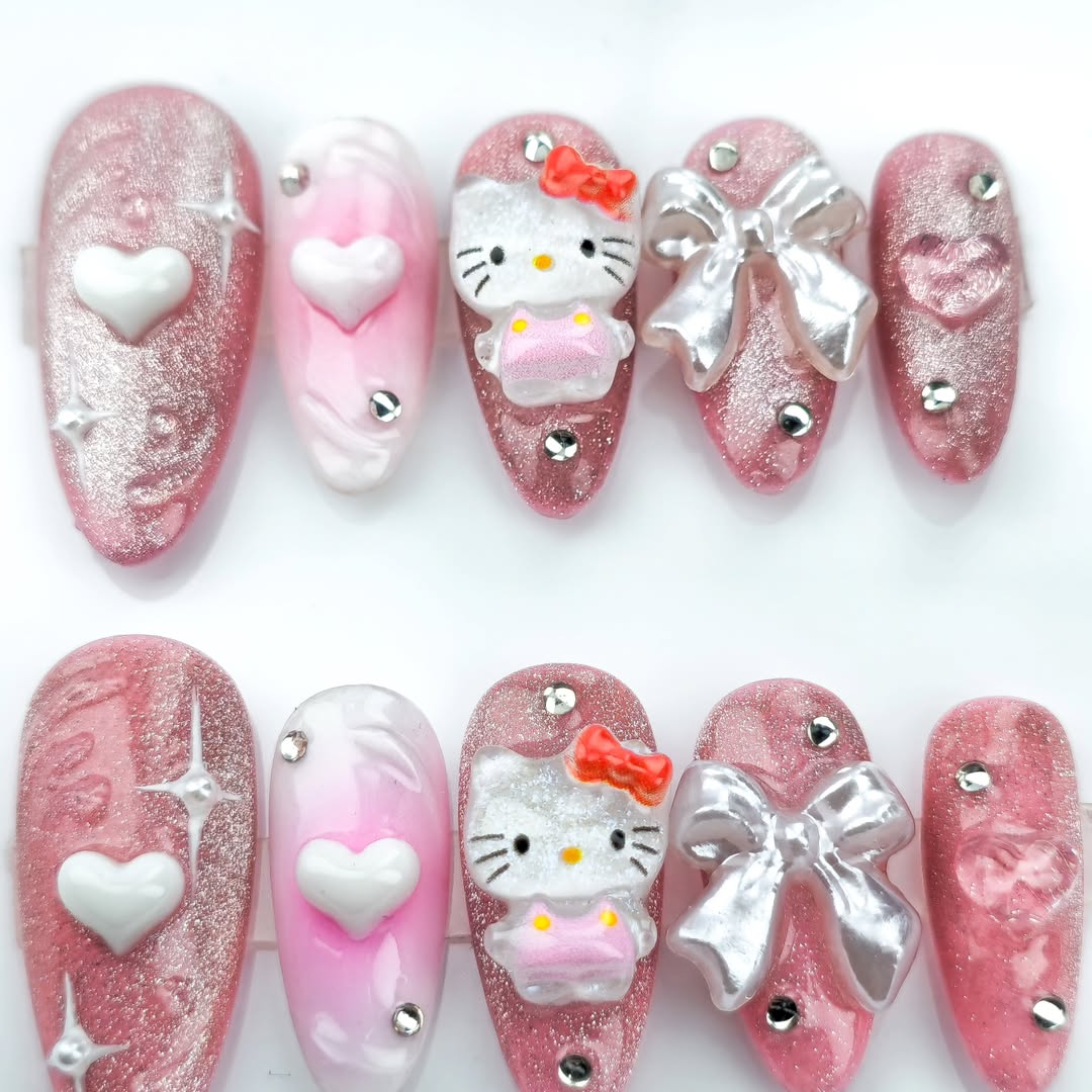 Unhas postiças em gel com design 3D delicado, glitter rosa e detalhes inspirados na Hello Kitty. Elegância e praticidade para qualquer ocasião!