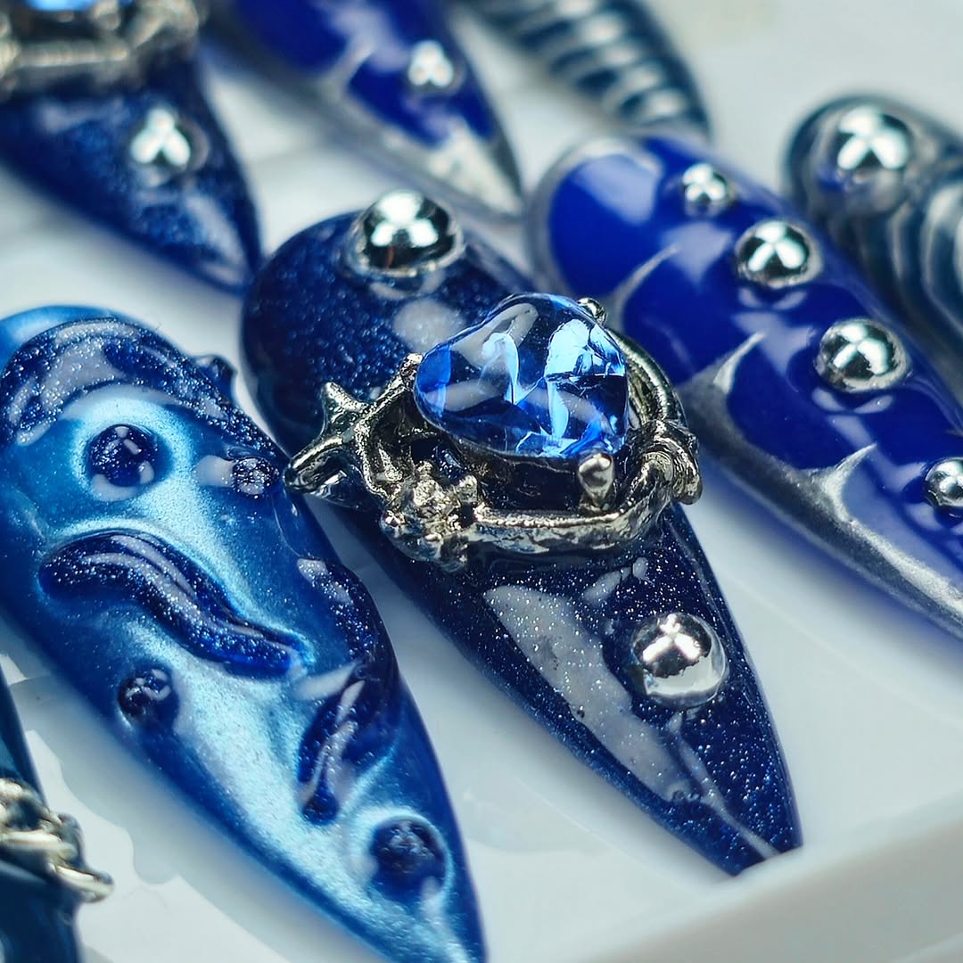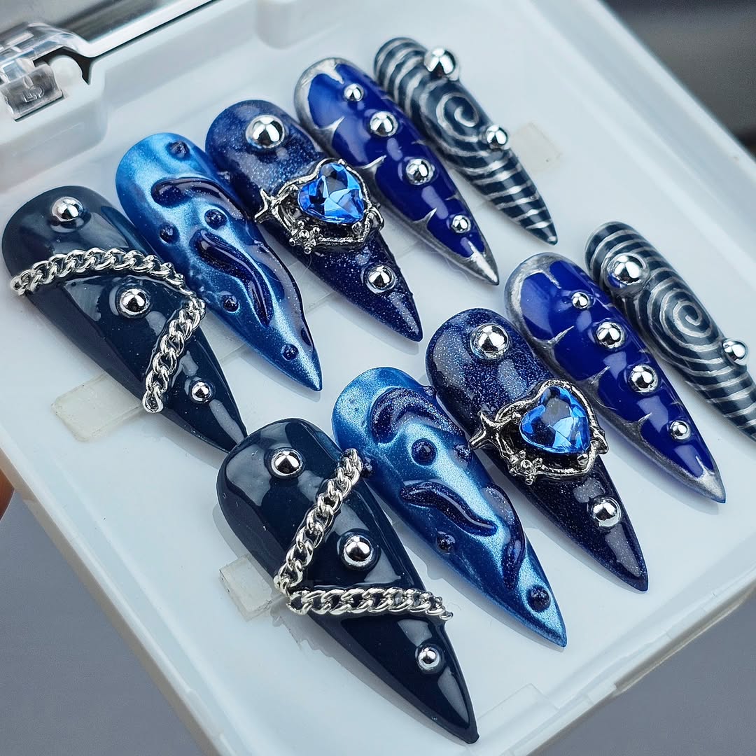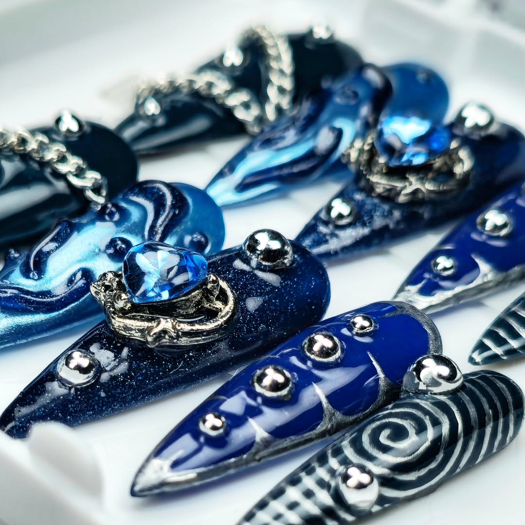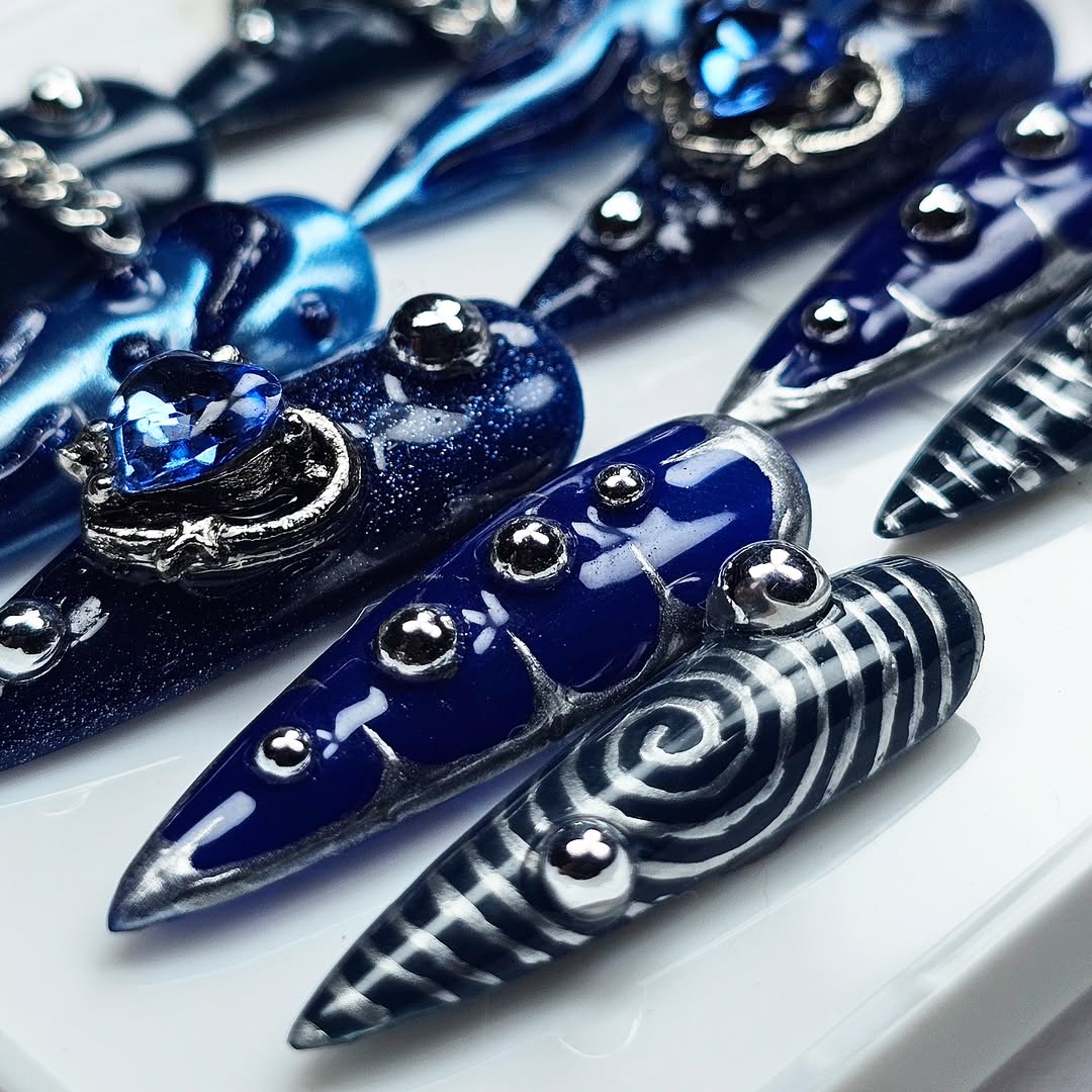 Unhas de gel azuis elegantes com detalhes metálicos e pedras preciosas – Design moderno e ousado. As unhas possuem acabamentos brilhantes, tons de azul escuro e marinho, e detalhes em corrente prateada, além de adornos com pedras zircônia azul. Ideais para quem busca um visual sofisticado e estiloso. Padrões espiralados e geométricos adicionam um toque futurista. Unhas de ponta para ocasiões especiais e para quem adora um design único e exclusivo.