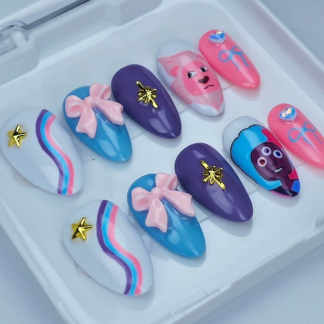 Unhas de gel desenhadas à mão com personagens icônicos de Steven Universe, incluindo Garnet e o Leão. O design traz laços rosa, estrelas douradas e ilustrações personalizadas feitas à mão, criando um visual único e alegre. As personagens, com seus estilos marcantes, ganham destaque em um estilo vibrante e encantador. Perfeito para fãs do desenho que querem uma estética divertida e personalizada.
